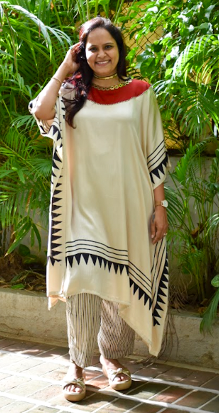 Chand kaftan s maid from soft modal silk in ivory color ,which creates perfect festive look and to complete look with our all time favourite stripe modal pants.
