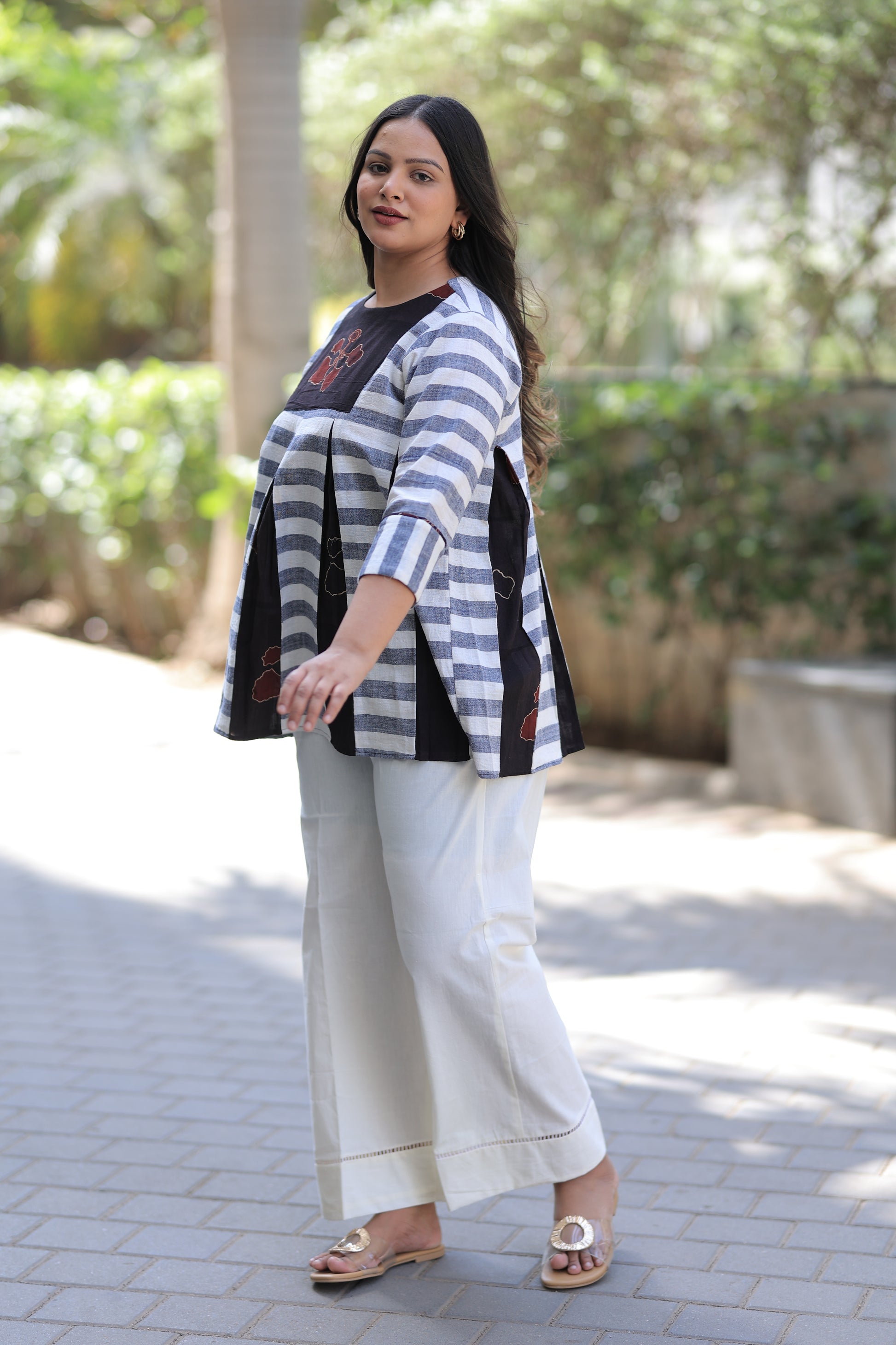 • Rustic Black Kusum printed cotton fabric with Black stripes kala cotton , a perfect combination of two sustainable fabric .